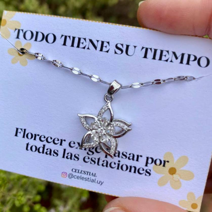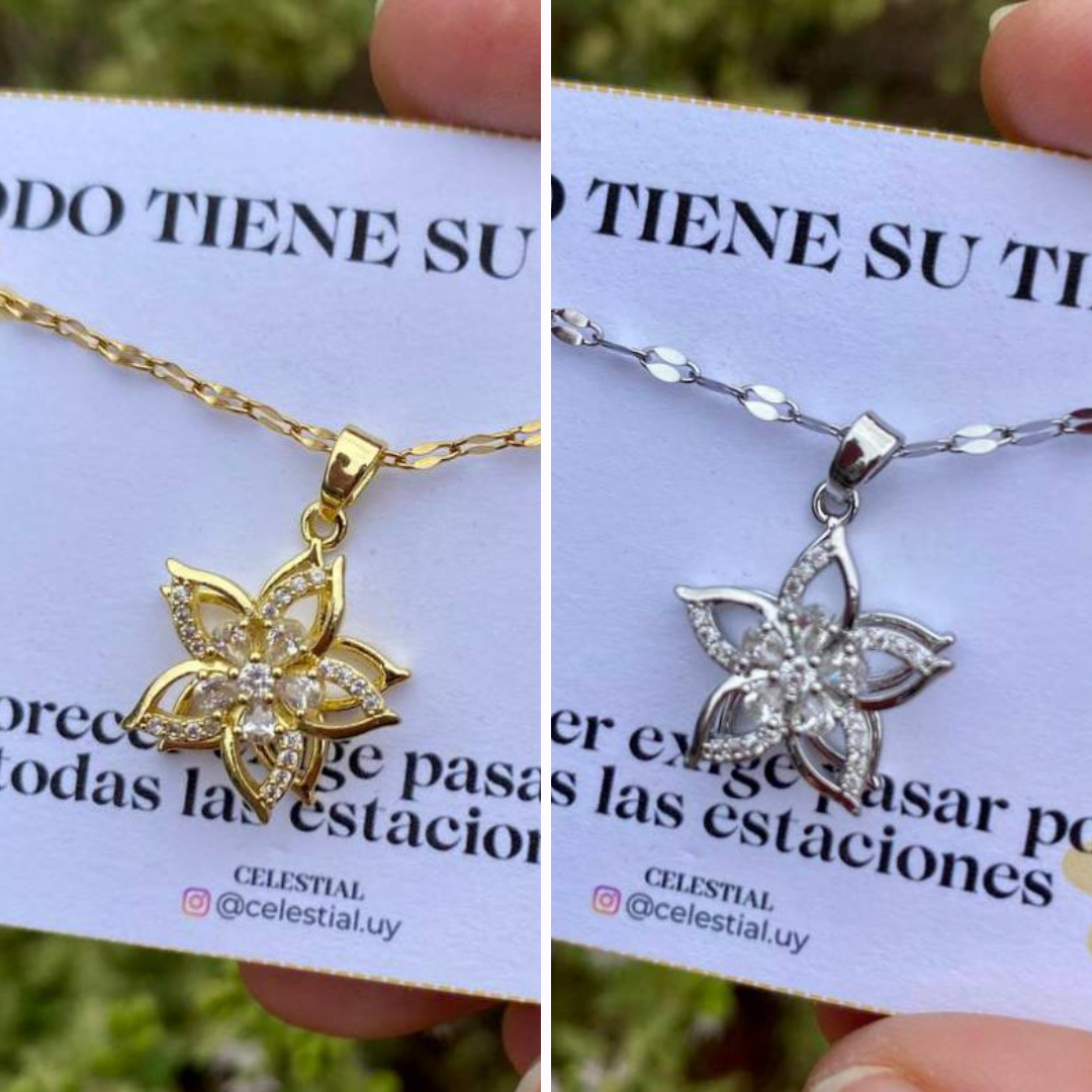 Collar de acero quirúrgico y dije de Flor giratoria antiestrés la dorada  enchapado en oro real de 18k y el plateado enchapado en platino real.